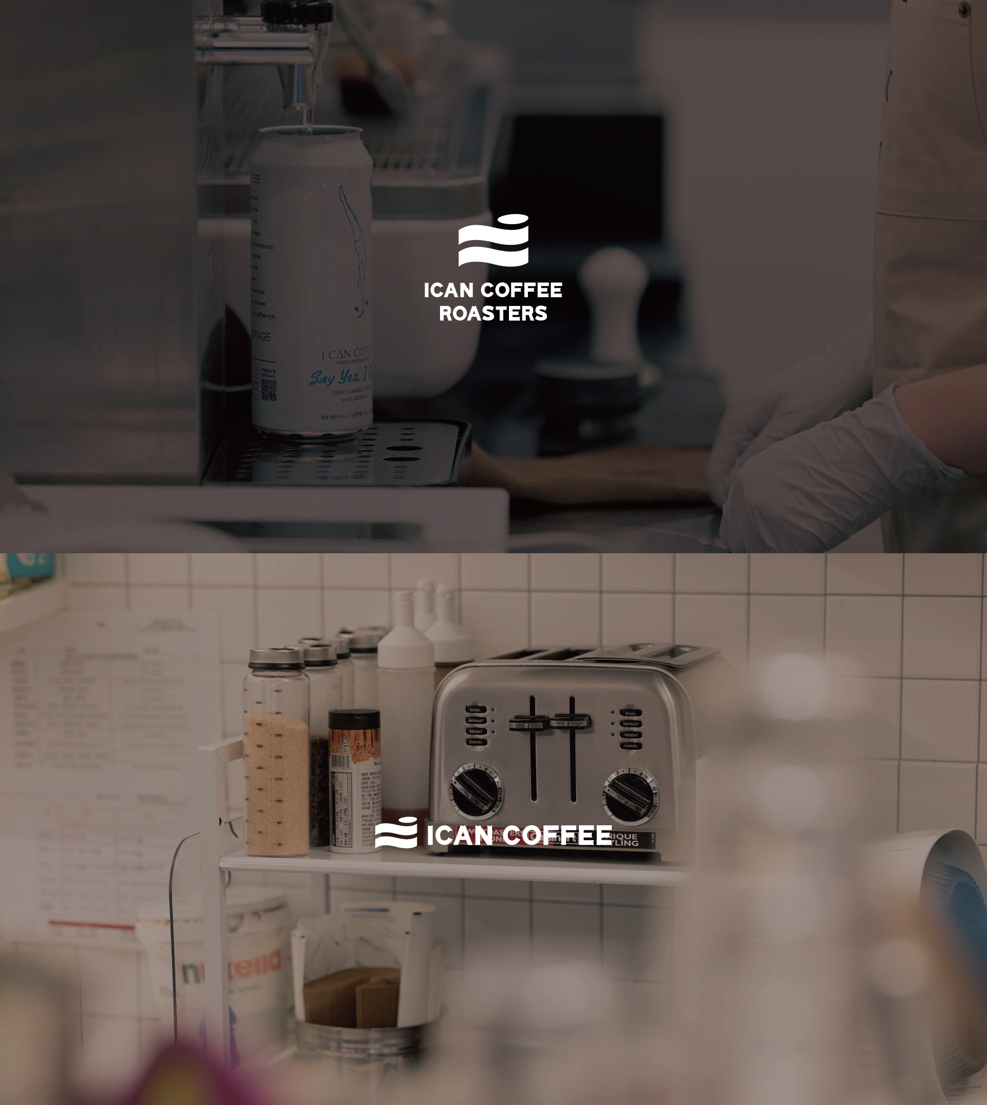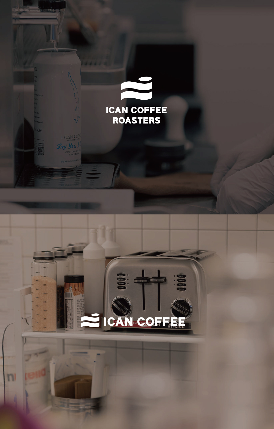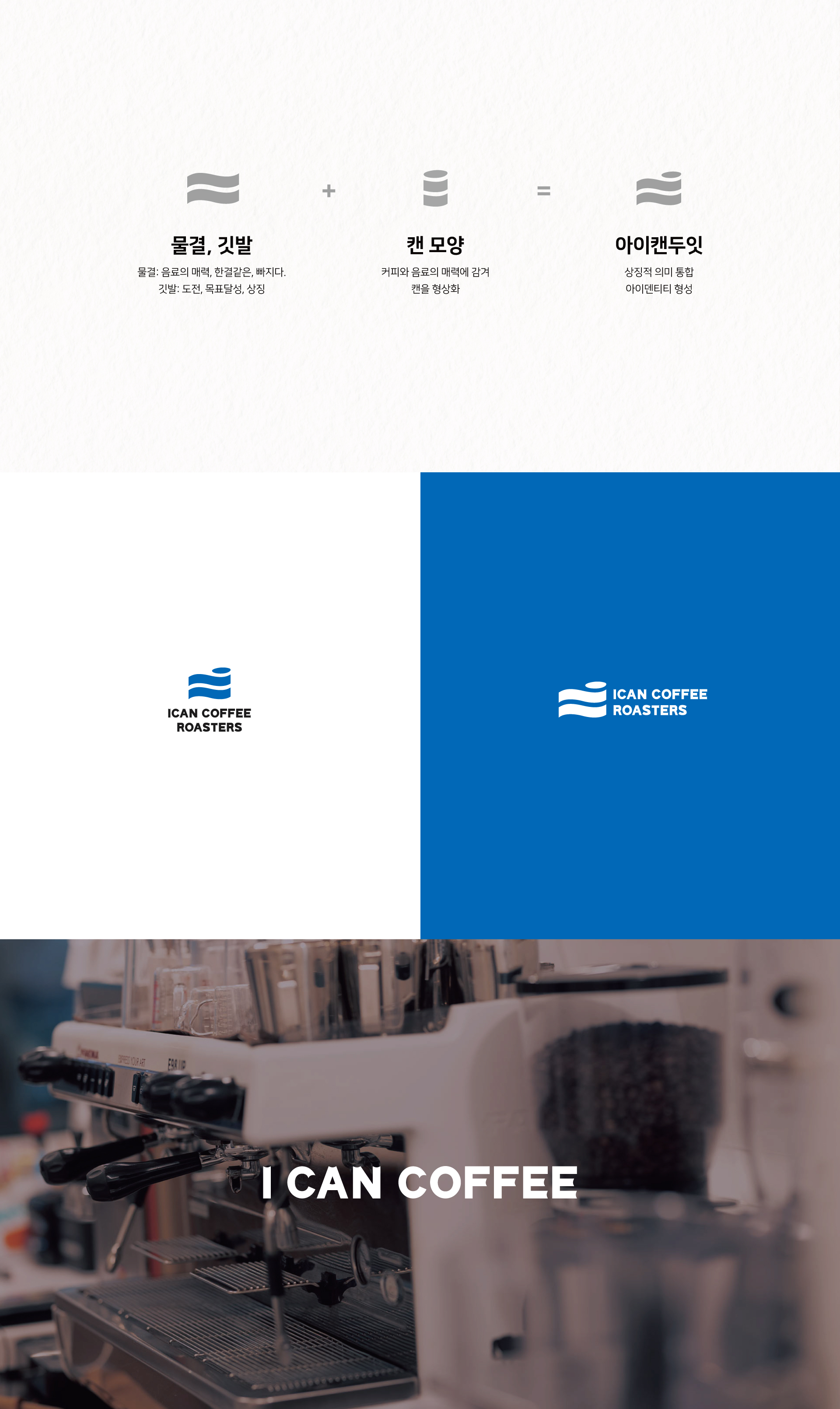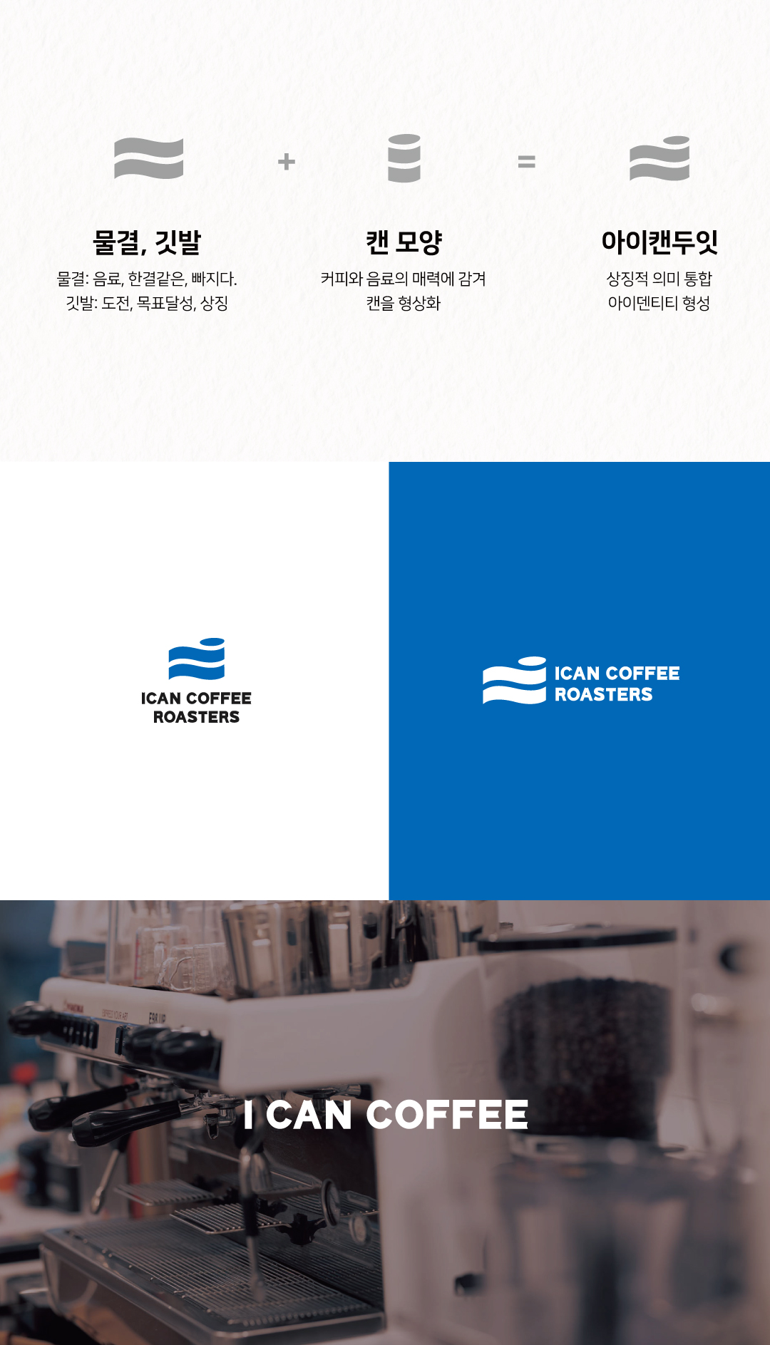 ‘I CAN DO IT’ 도전을 의미하는 브랜드 슬로건과 아이캔커피가 지향하는 ‘일관성 있는 맛있는 커피’ 그리고 테이크아웃 캔이 조화롭게 상징화 될 수 있도록 물결, 깃발, 캔 모양을 모티브로 심볼과 타이포그라피의 아이덴티티 디자인을 적립하였습니다.